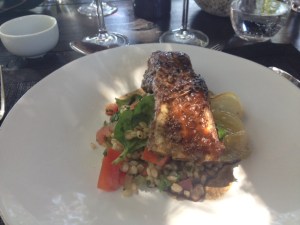 -Merluza austral aderezada de hierbas, ajo y cebolla con crema de maíz con leche; quinoa con salsa de calamares y cebolla. Chardonnay Gran Reserva.